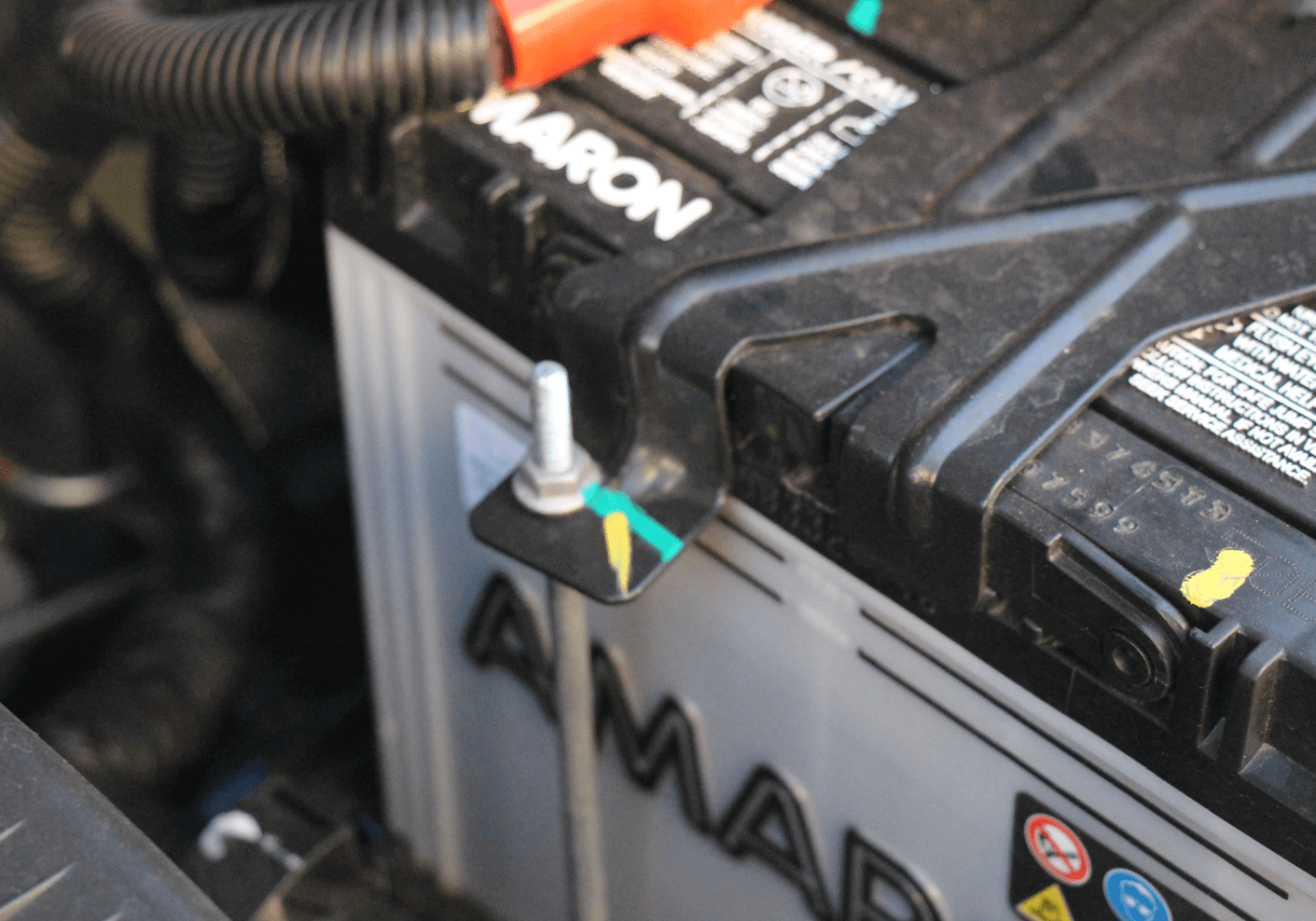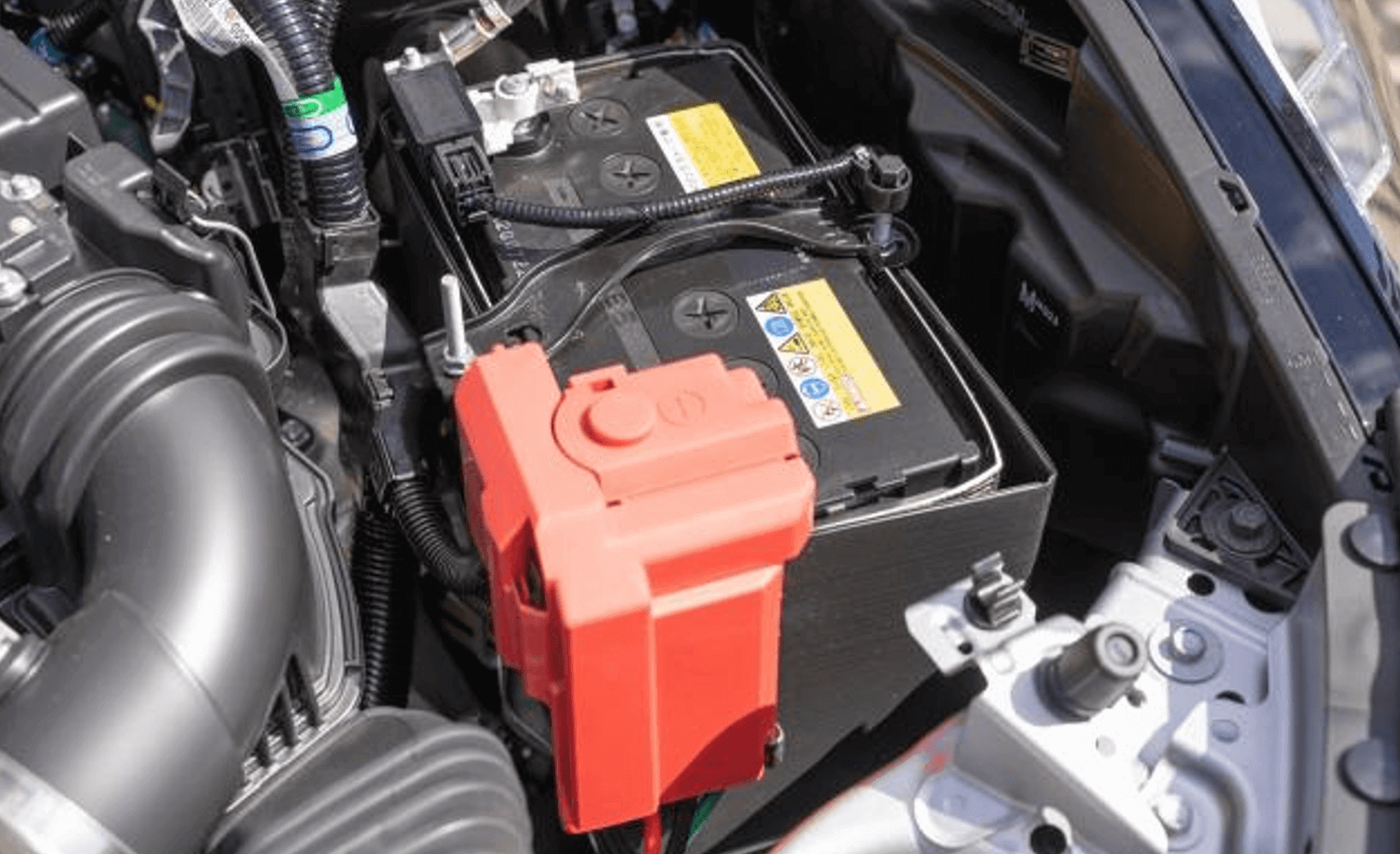 배터리는 보닛 안쪽에 탑재되어 있으며, 엔진에는 발전기라는 제네레이터가 엔진의 회전력을 전기로 바꾸어 주고 배터리가 전력을 저장하고 있습니다.
