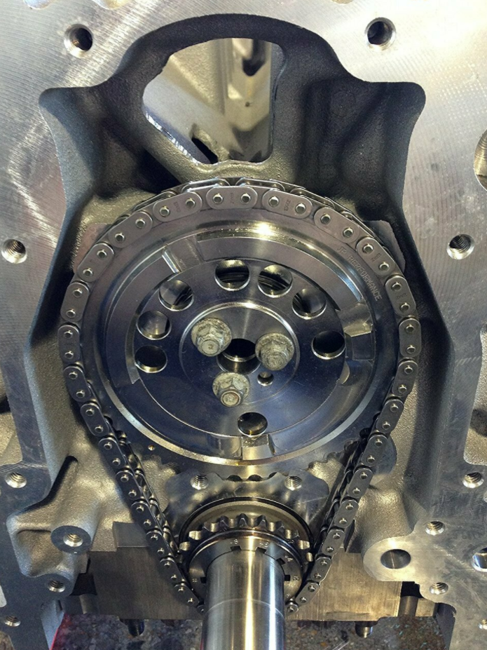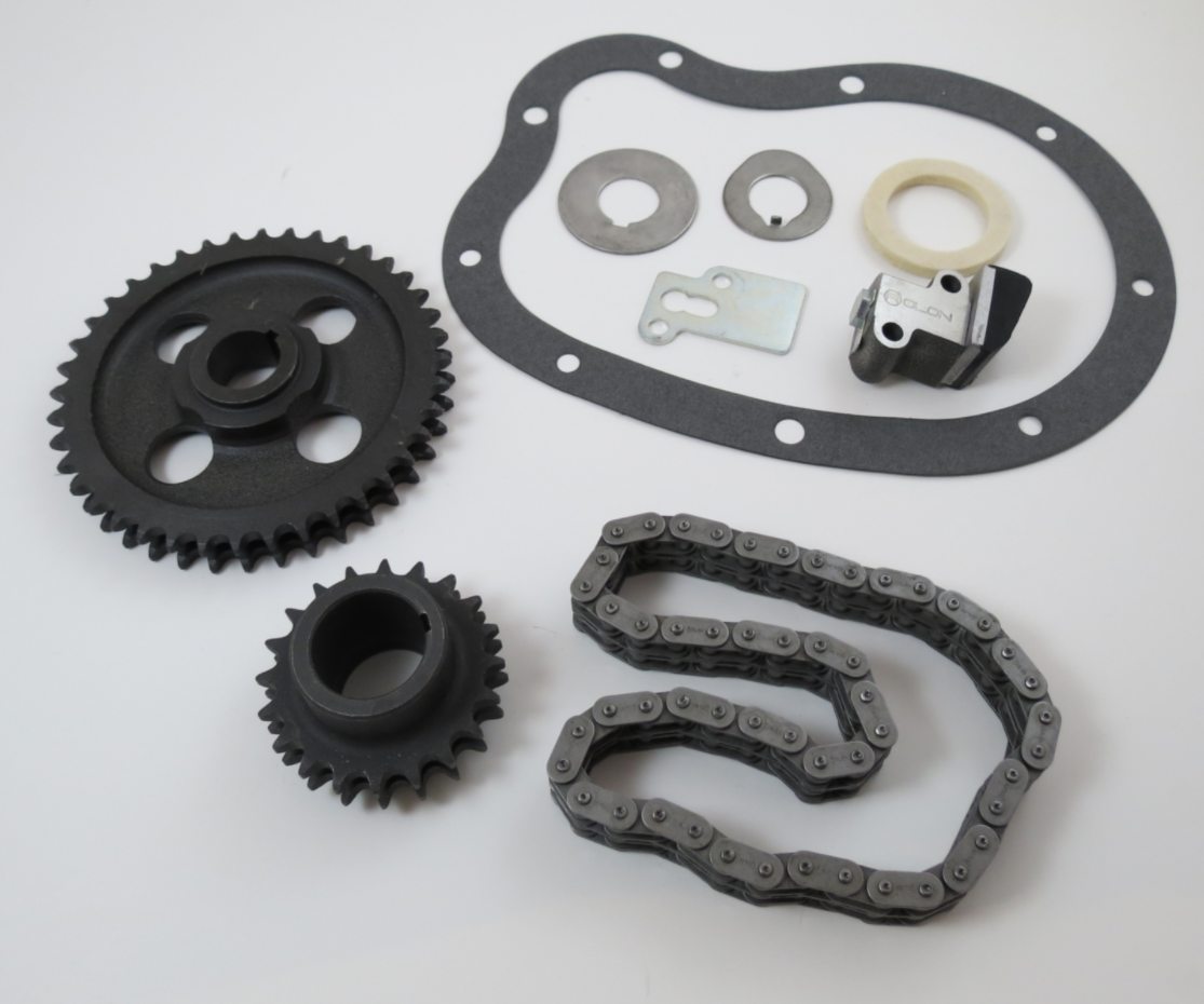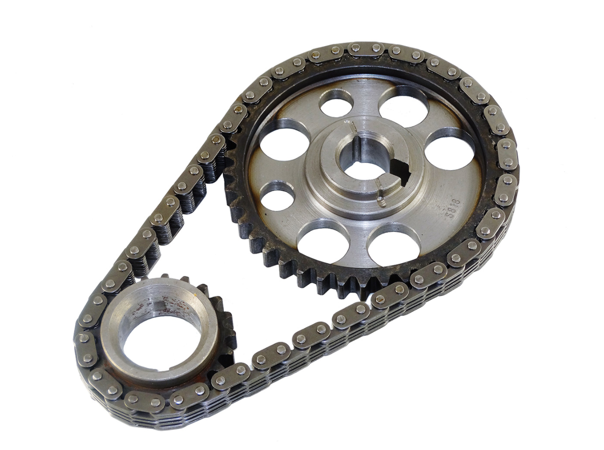 이러한 엔진의 크랭크축에는 항상 강철 기어가 장착되어 있으며 크랭크축 보스에 고정되어 크랭크와 하나를 유지하며 캠축에는 일반적으로 유사한 배열의 알루미늄 기어가 있으며 캠축 기어 톱니는 플라스틱으로 두껍게 코팅되어 있습니다. 캠축 기어의 직경은 설계상 크랭크축 속도의 절반으로만 회전하기 때문에 캠축 기어의 직경은 크랭크축 기어의 두 배입니다. 이것은 현대 엔진에서도 마찬가지입니다.