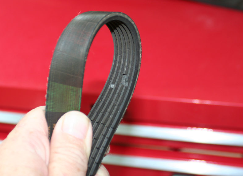 정비사는 절단, 균열, 누락된 덩어리 및 기타 마모 징후를 찾습니다. 일반적으로 벨트가 마모되었는지 확인하는 것은 매우 쉽습니다. 예를 들어, 위 사진의 오래된 벨트는 균열을 보여줍니다. 마모된 구동 벨트 균열 및 누락된 청크를 보여주는 구동 벨트. 늑골이 있는 쪽에 트레드 재료의 덩어리가 누락된 벨트를 보여줍니다. 벨트에서 삐걱거리는 소리가 나거나 늘어나거나 손상된 경우에도 벨트를 교체해야 할 수 있습니다. 마모된 구동 벨트의 초기 징후 중 하나는 비가 오는 날씨에 삐걱거리기 시작할 때입니다.